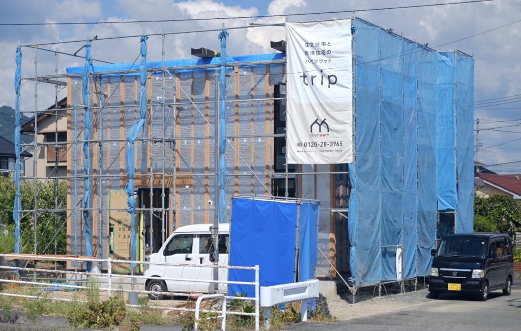 trip住宅の特徴である2階まで吹き抜けの大きな窓の様子も見えてきました。大きな窓から太陽の光がたっぷりと、そして心地よい日差しが入ってくるよう統計されています。そろそろ木のぬくもりが感じられる外壁も見られそうです。