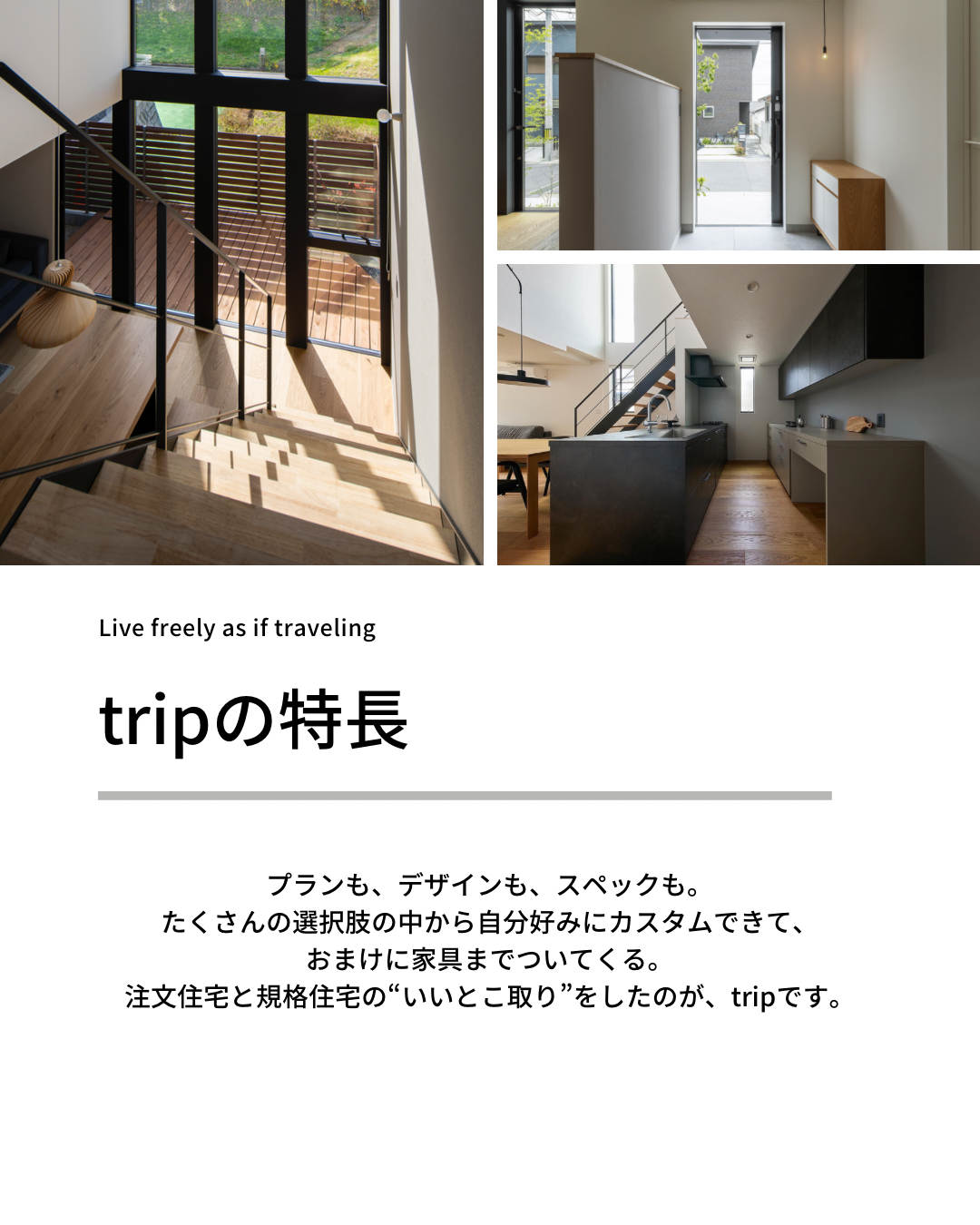 100点満点の家づくりはなかなか難しいものですが、注文住宅と規格住宅の“いいとこ取り”をしたのが、tripです。
