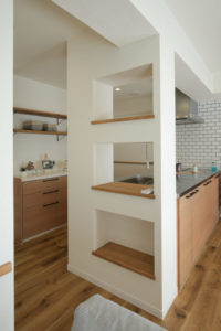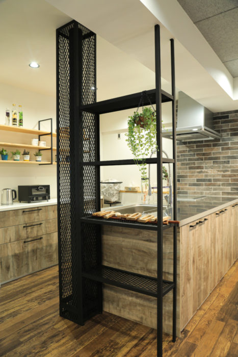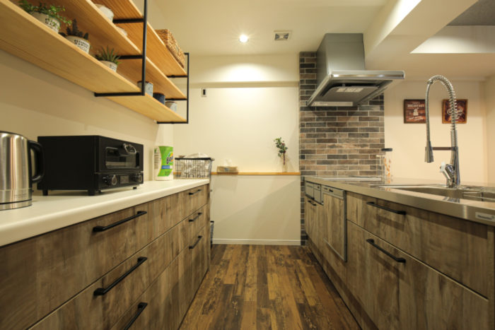 キッチンサイドに設置したアイアンシェルフは完全オリジナル。