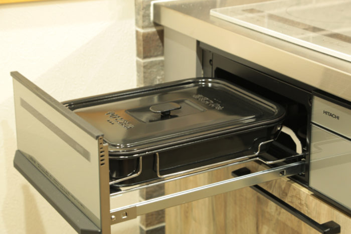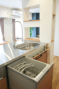 開放感のあるオープンキッチン。天板はヘアーライン仕上げ、またダイニング側に収納を持たせ、見せたくない小物もスッキリと隠します。