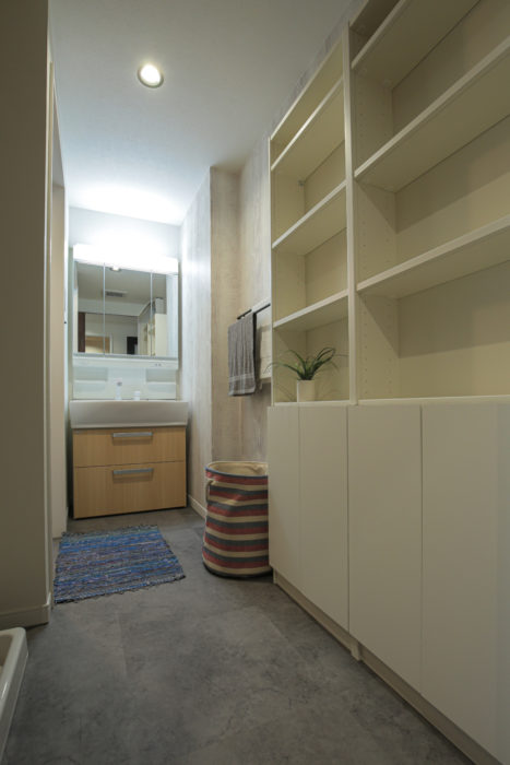 洗面脱衣室には小物が集まり、色々と片付きにくいところです。収納はどれだけあっても困りません。洗面台の収納はもちろん洗濯機前には扉付の収納と、