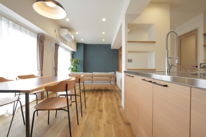 南側の日差しが魅力のこの部屋は、リノベーション前の間取りではキッチンまで日差しが届いていなかったので、元々囲まれていたキッチン周りの壁を撤去し、レトロな雰囲気を大切にしつつも開放的なスペースを生み出しました。