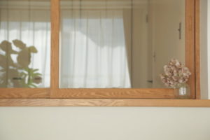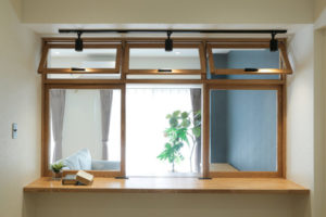 室内窓の下窓枠をカウンターにして、パソコンや趣味を楽しめるコーナーに。