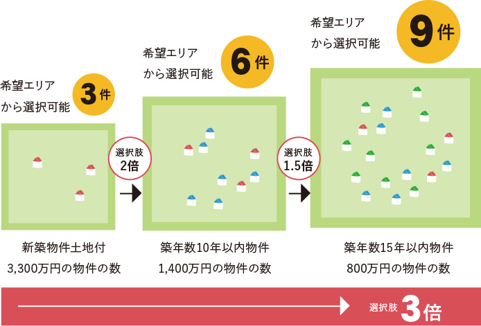 例えば、家を購⼊する際、「希望区域より徒歩10分エリア」という希望条件がある場合、新築だと希望エリア内の候補は数えるほどしかないでしょう。