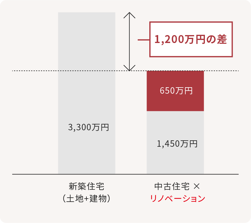 ⼀⽅、中古住宅をリノベーションする場合、築年数が経っていたとしても「⼟地・建物」への費⽤は新築の約半額となり、リノベーション代に650万円使⽤しても残りの1,200万円を「インテリア」や「家具」などに予算を回す事ができます。