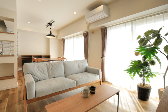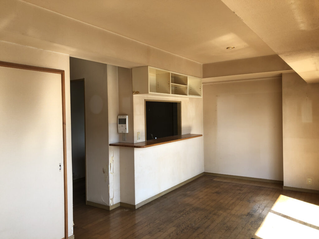 南側に面しているにも関わらず対面キッチンが閉鎖的で暗かったので、キッチンとダイニングを仕切る壁を撤去し明るさを取り込みました。