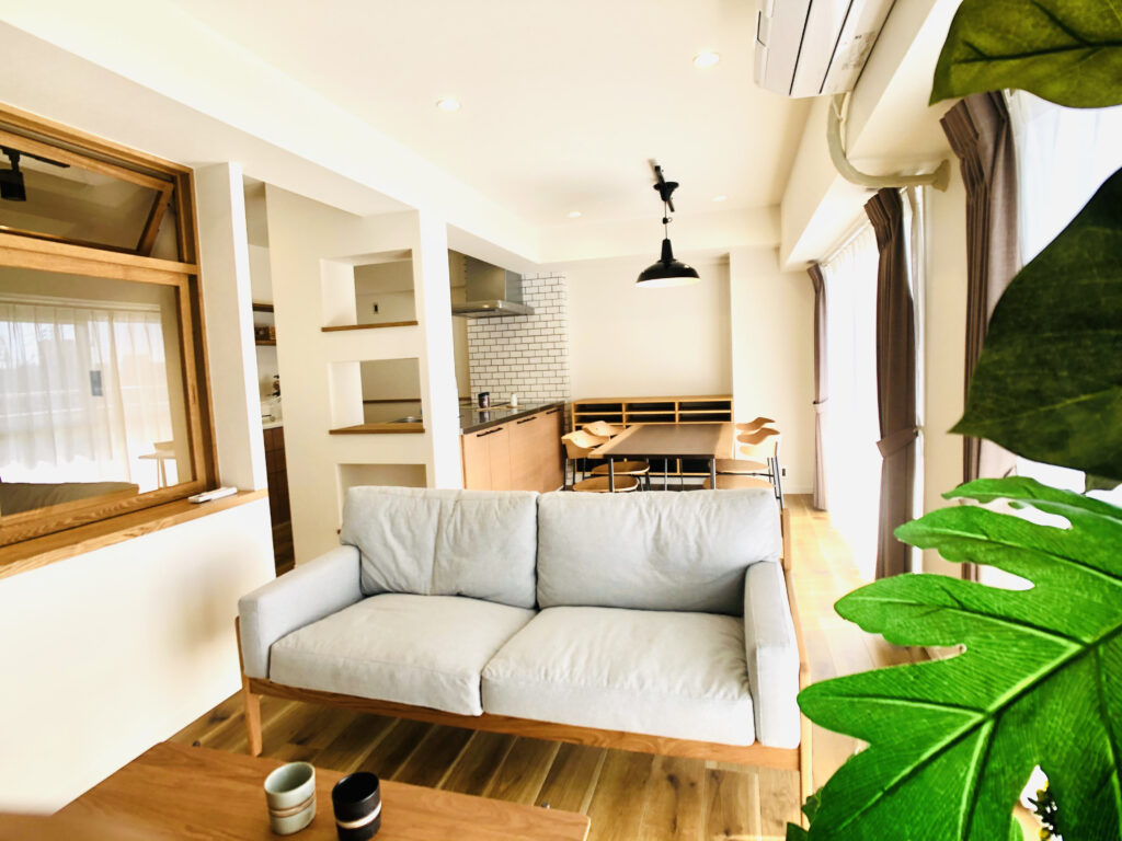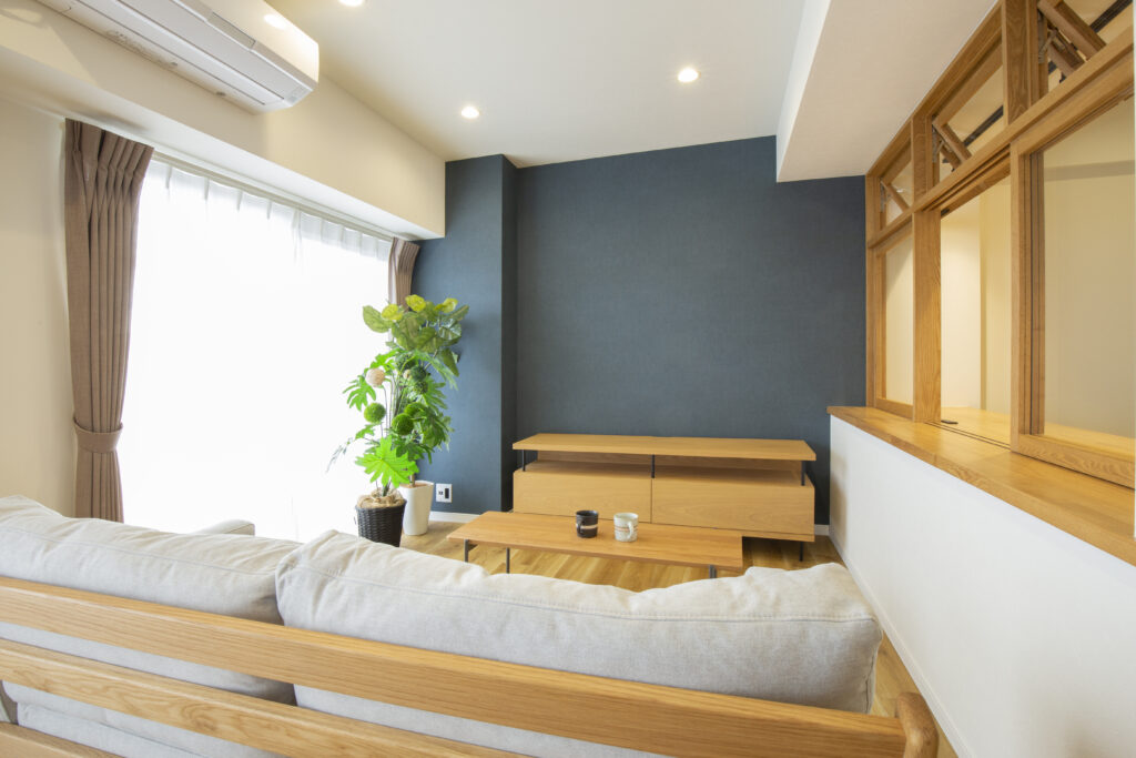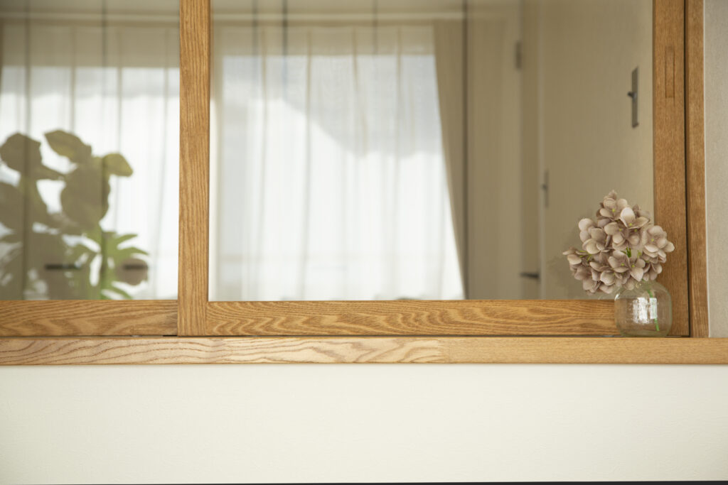 リビング横の閉鎖的で暗かった和室を洋室化し、室内窓を新規に作成し、リビングとの繋がりを保ちながらリモートワークができるような個室を作りました。