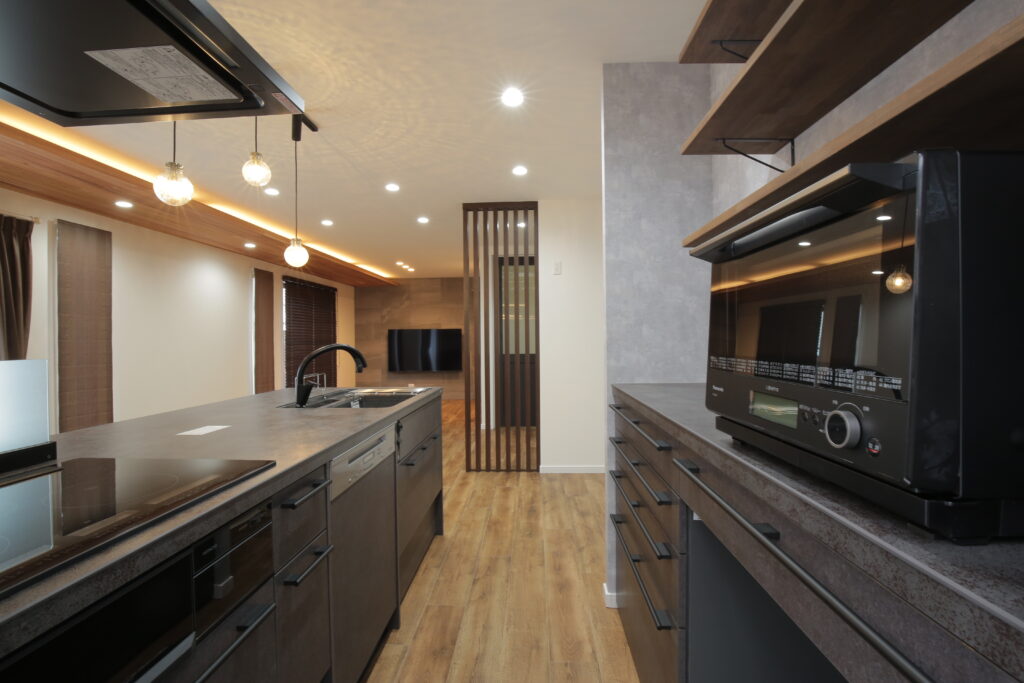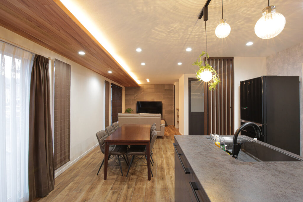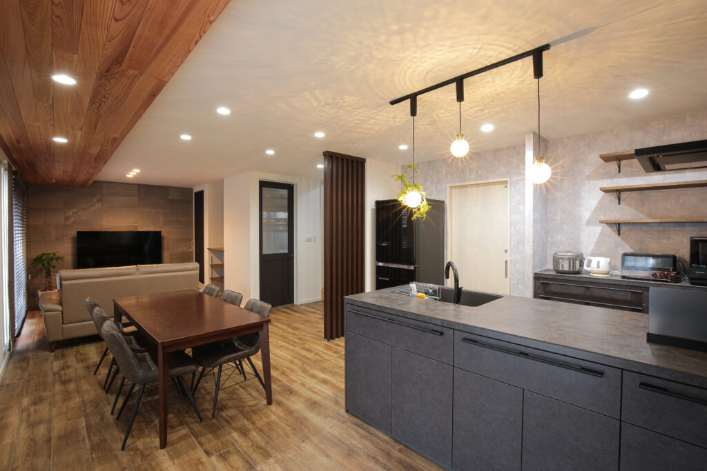 LIXILキッチンリシェルSIのセラミックトップはBASALT BLACK。その無骨な表情にに合わせて、天井の一部にレッドシダーと共に間接照明を設置しました。