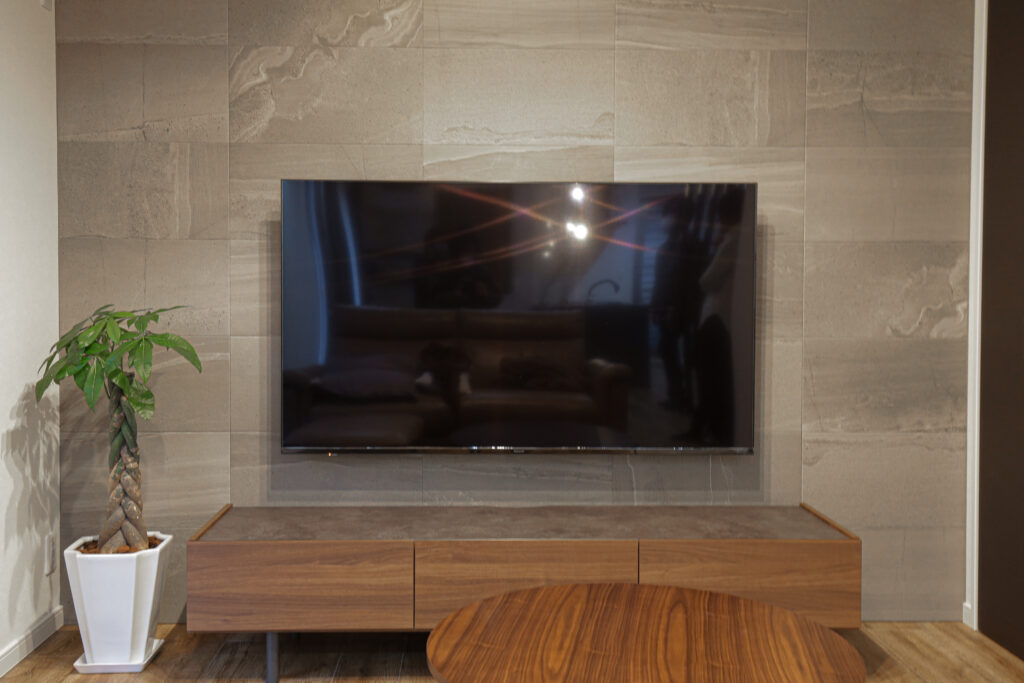 最近おすすめしているのはテレビの壁面設置。テレビボードにテレビを乗せると裏の配線まわりには埃が溜まりがち。そんな時はテレビと録画用HDD機器の配線を壁内に隠配線します。テレビを壁掛けとするために壁面補強することで、テレビをテレビボードから浮かし、スマートなリビング周りを作り出せます。