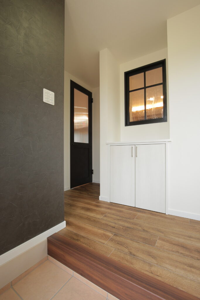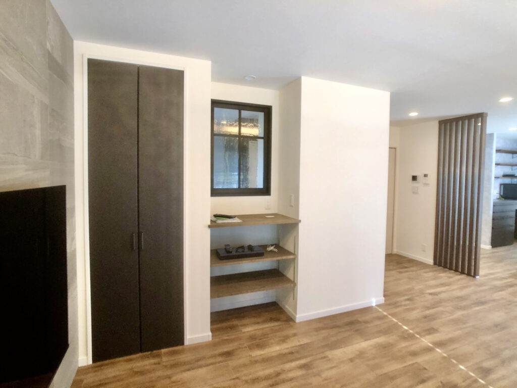 リビング横には見えない収納と、可動式の見せる棚を。帰ってき時に家族の気配を感じられる。ご夫婦こだわりの室内窓も設置しました。