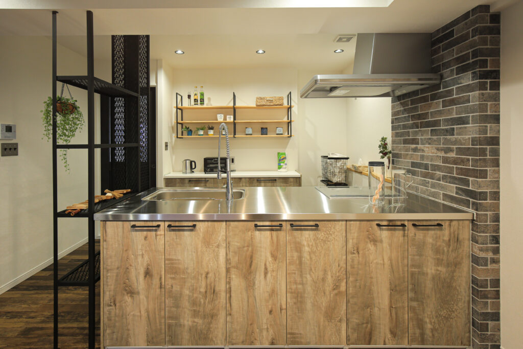 キッチンの天板はヘアーライン仕上げ。傷が目立ちにくく滑りにくいのが特徴。