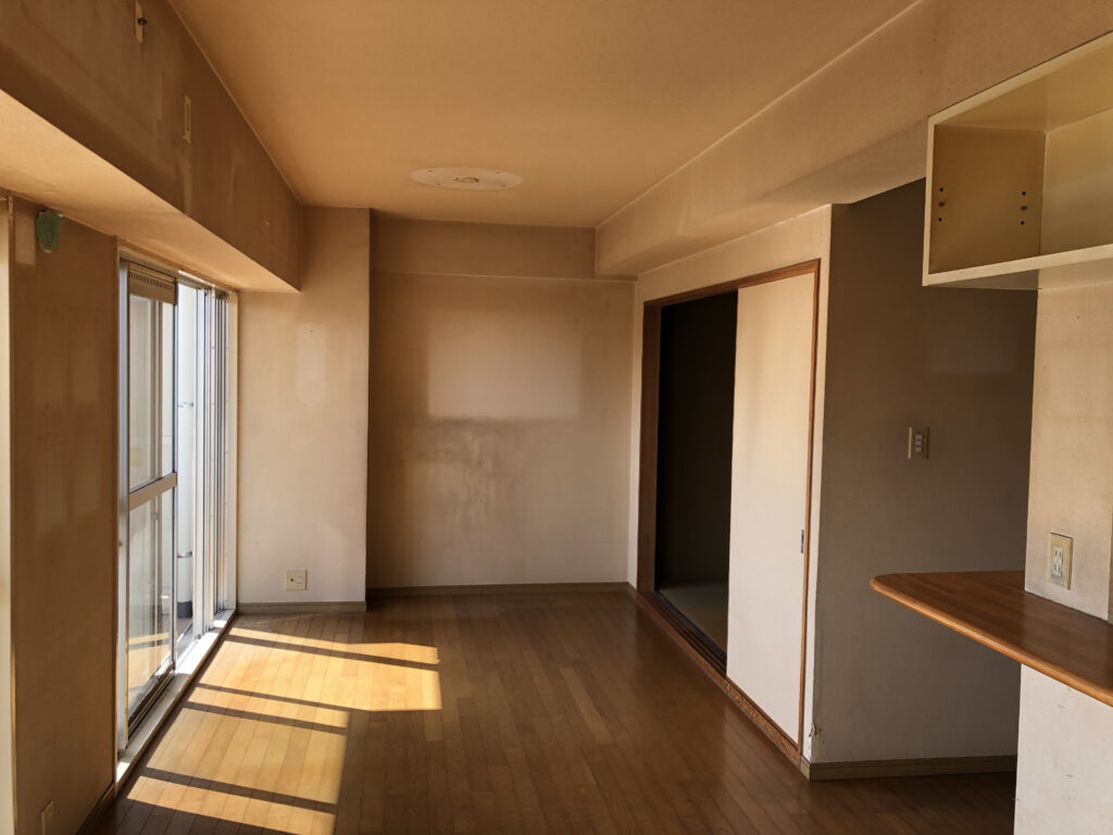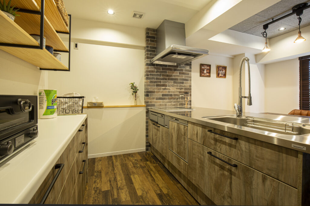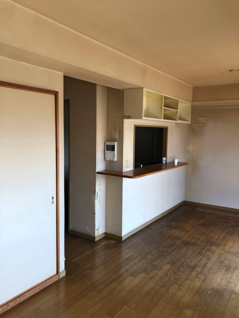 南側に面しているにも関わらず対面キッチンが閉鎖的で暗かったので、キッチンとダイニングを仕切る壁を撤去し明るさを取り込みました。