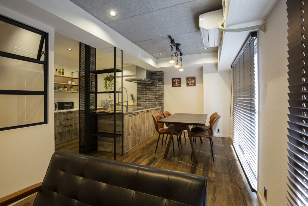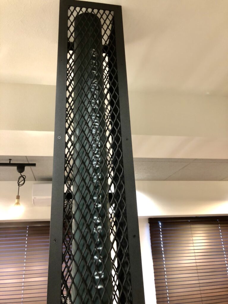 キッチン側面のあった壁の中は32年前新築された当時から壁の中で光を浴びることなく綺麗なままの鋼材配管が現れました。見た目とても格好良く部屋のイメージにもあっていて、そのまま隠すのは勿体なかったので、エキスパンドメタルで囲いマットブラックのサンドブラスト塗装で仕上げました。